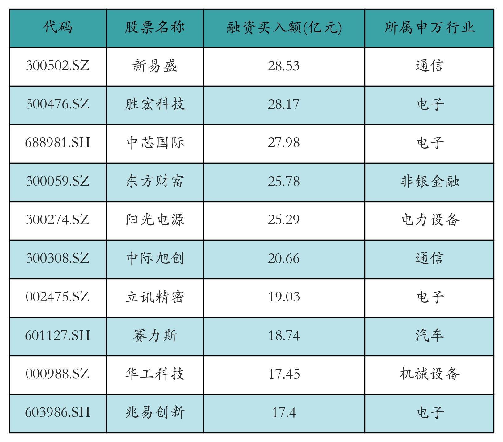 两市共有3441只个股有融资资金买入,其中新易盛、胜宏科技、中芯国际排名前三,买入金额分别28.53亿元、28.17亿元、27.98亿元。融资买入额前10个股详情见下表: