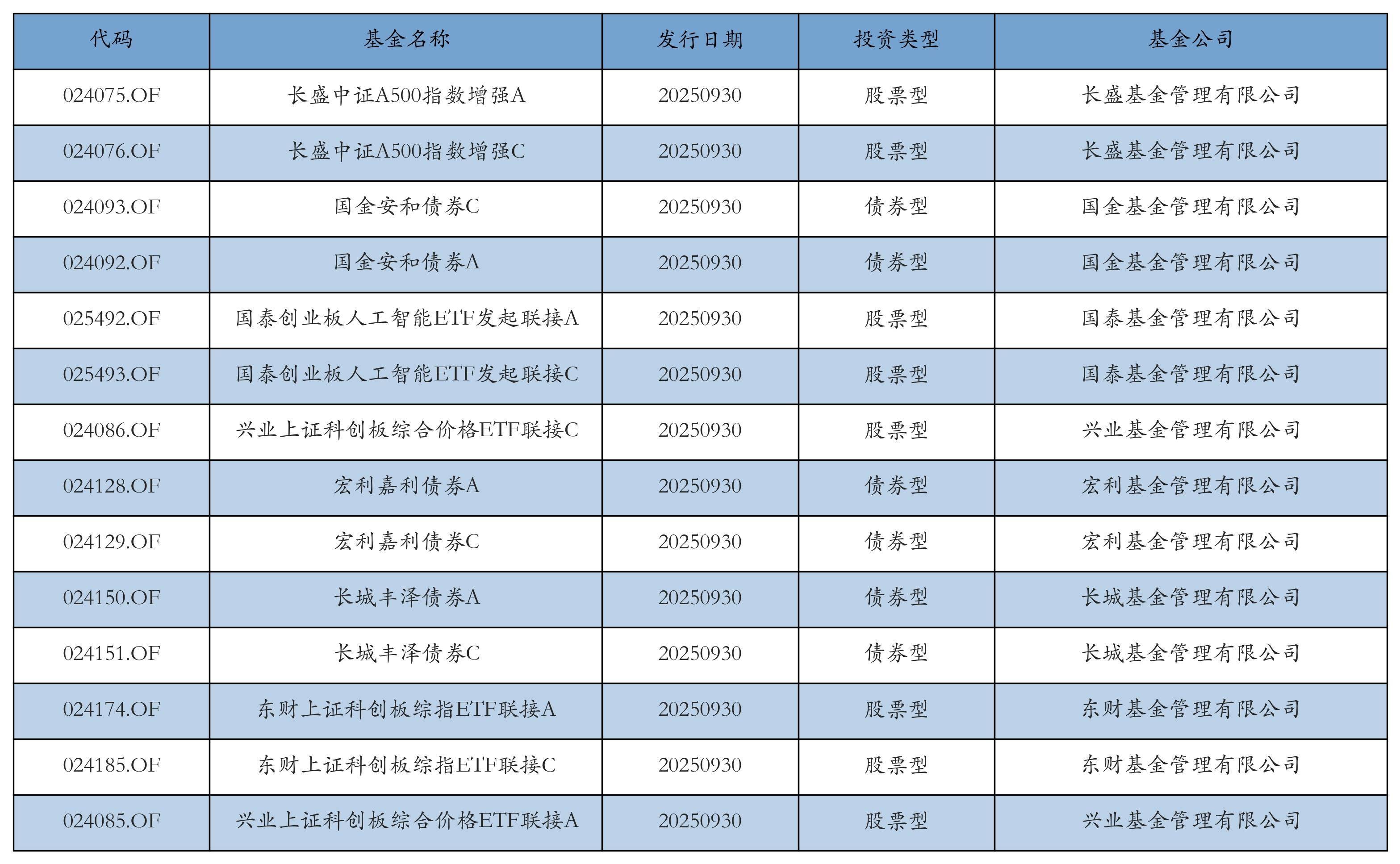 9月30日有14只新基金发行,分别为:长盛中证A500指数增强A、长盛中证A500指数增强C、国金安和债券C、国金安和债券A、国泰创业板人工智能ETF发起联接A、国泰创业板人工智能ETF发起联接C、兴业上证科创板综合价格ETF联接C、宏利嘉利债券A、宏利嘉利债券C、长城丰泽债券A、长城丰泽债券C、东财上证科创板综指ETF联接A、东财上证科创板综指ETF联接C、兴业上证科创板综合价格ETF联接A,详情见下表: