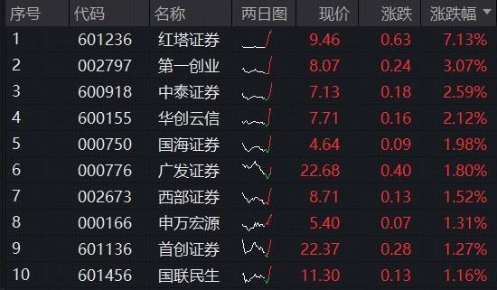 板块个股多数飘红,红塔证券领涨7%,第一创业涨超3%,中泰证券、华创云信、国海证券涨超2%,广发证券、申万宏源等涨逾1%。